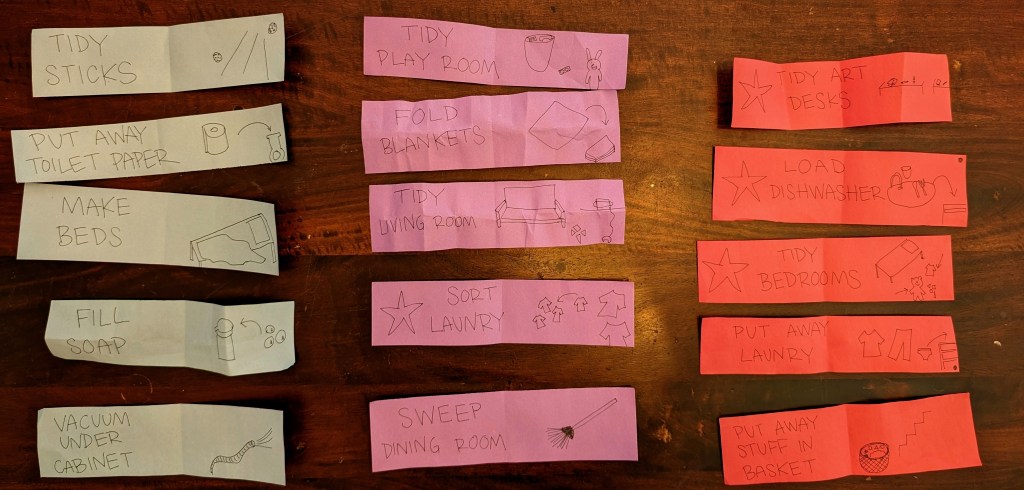 The oldest was motivated and proud of doing more challenging chores, instead of claiming they were unfair. The youngest pulled a slip, figured out what it meant (based on my very rough drawings), and got it done enthusiastically and independently. It was adorable, and the toilet paper was distributed to bathrooms throughout the house. Another cheered when he got the chance to use dad’s fun workshop vacuum. And within an hour, you could walk into their rooms without fear of injury. Wins all around!